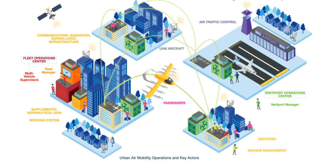 为了实现这一点,它要求建造新的机场,在那里乘客将被送入和送出空中出租车,然后这些出租车将自主地飞行既定的路线,同时由“一个‘人在环形’监督站(作为)飞行执行的最终机构 ”进行监督。这些设备将是一个更广泛的数据网络的一部分,该网络的建立是为了监测单个飞行器、正在运行的更广泛的空中出租车和送货无人机车队,以及在线乘客登记和vertiport地面管理。