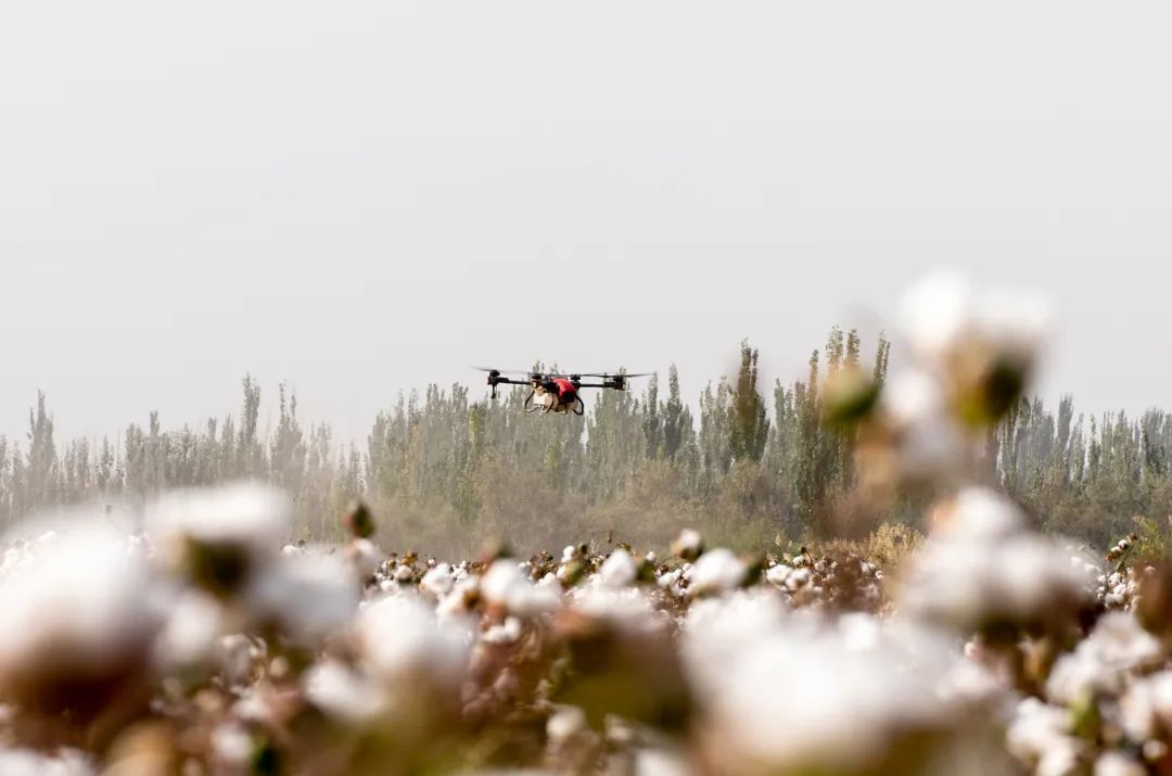 极飞农业无人机为棉田精准施药在管理决策环节,超级棉田使用人工智能来识别每一块农田的种植规模、基本苗数量和发芽率。在收割前,系统还能计算棉花吐絮率,让管理者更好地判断喷药、撒肥、灌溉等农事作业的最佳时机。
