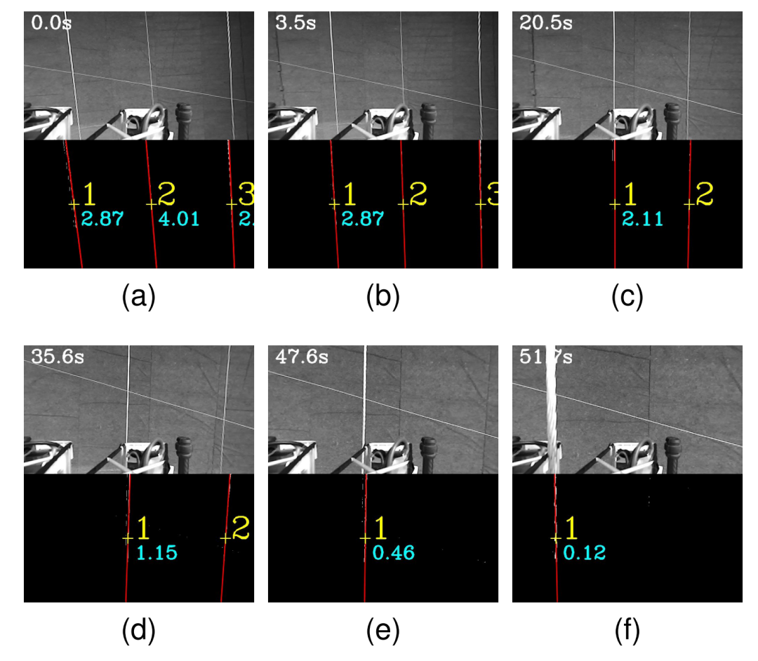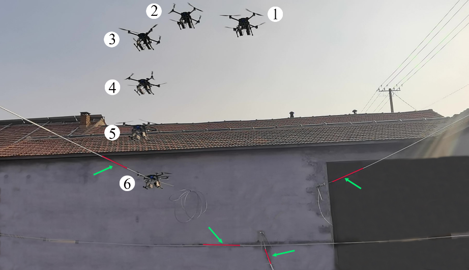 起飞无人机到离地5m左右位置,切换至自动模式。下图展示了自主降落过程中相机图像。首先,平行电力线被检测并赋予唯一标识;无人机自动选择1号电力线作为目标电力线,自转与1号电力线线对齐;然后,无人机左移并下降接近目标线,在线上方0.5m左右高处悬停并修正,最后匀速降落到电力线上。