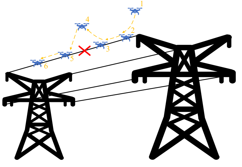 如下图所示,两栖机器人可以在电力线上以爬行的方式进行精细化巡检,在遇到障碍时,可以飞行越过障碍。采用两栖机器人进行电力线巡检,可以大大提高巡检效率。