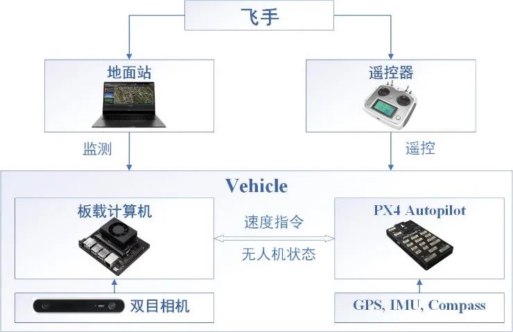 系统结构如下图所示。飞手可以通过遥控器切换无人机飞行模式。当处于自动模式时,无人机通过由双目相机和板载计算机NX组成的视觉系统自主导航。板载计算机可以检测并计算电力线的位置,并通过Mavros协议向低级控制器PX4发送速度控制指令,同时接受无人机状态作为反馈。飞手可通过地面站监控无人机飞行状态、实时图像等,以保证巡检质量。