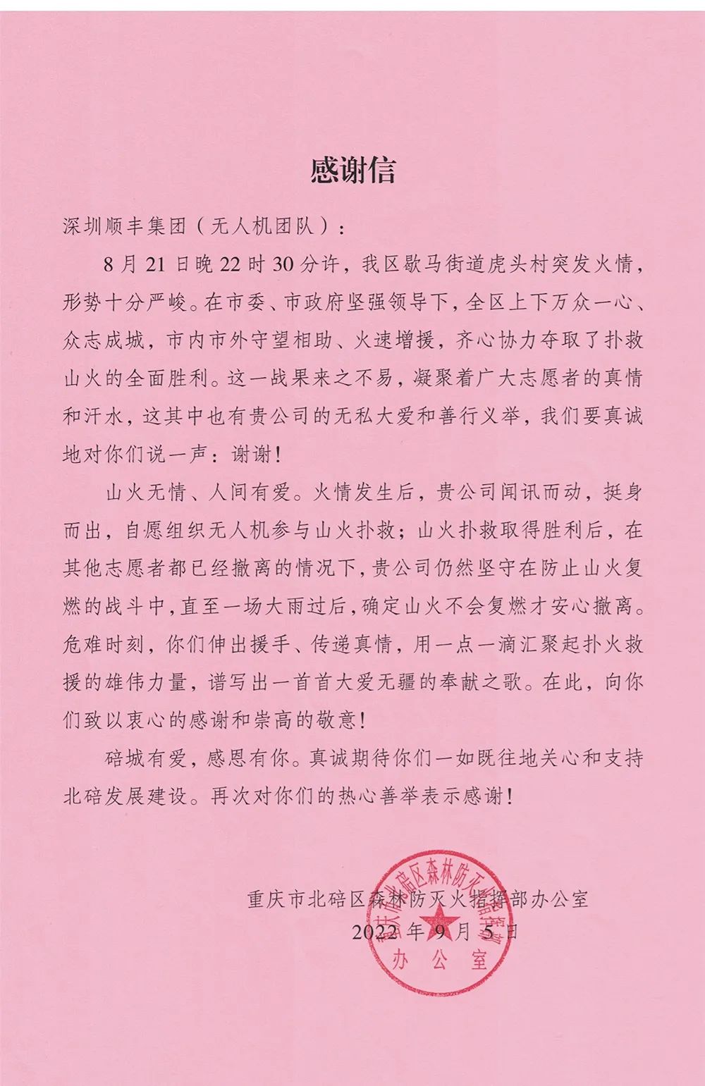 近日,顺丰集团(无人机团队)收到来自重庆市北碚区森林防火指挥部办公室的感谢信。信中提到, 顺丰无人机团队闻讯而动,挺身而出,自愿组织无人机参与山火扑救,利用先进技术发挥战术优势,实现“地—空”间高效的协同配合,为保卫重庆贡献出一份自己的力量。