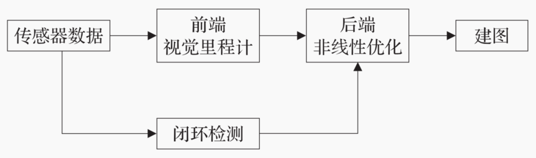 典型的视觉自主导航框架,由传感器数据、前端视觉里程计、后端非线性优化、回环检测、建图等部分组成,如图所示。