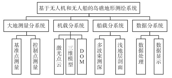基于无人机和无人船的岛礁地形测绘系统由大地测量分系统、机载分系统、船载分系统以及数据分系统组成。各分系统见图1。