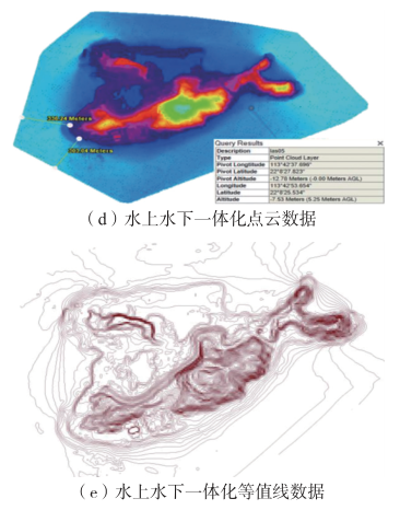 图3(b)为无人机空中测量获取的海岛陆地地形。由于多波束不能采集水深较浅区域地形,造成水下测量盲区,见图3(c)。通过人工RTK测量补测,融合多波束及激光扫描数据,实现了海岛水上水下全覆盖测量,形成了高分辨率点云及等值线成果,见图3(d)及图3(e)。
