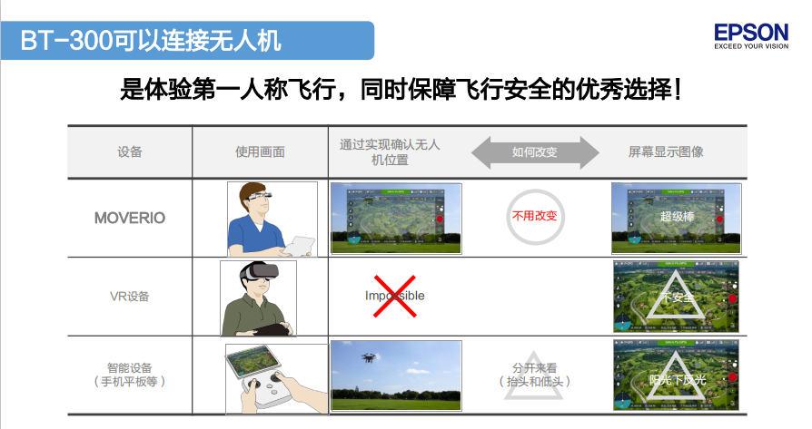 而今天我们要介绍的这款爱普生BT-300智能眼镜,在带来第一视角飞行体验的同时,相比手机屏幕可以提供更大屏的显示效果,并且在户外高亮光照条件下避免手机屏幕反光的缺陷;相比传统头戴式无人机FPV眼镜,它更像是一副真正意义上的眼镜——仅重69克,十分轻量化(并且通过透视型设计观察无人机在空中的位置,增添了安全感)。