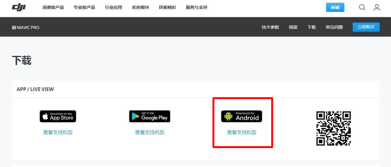 第一步:登陆大疆官网,选择相应产品型号,点击型号页面的下载部分找到 App。点击图
