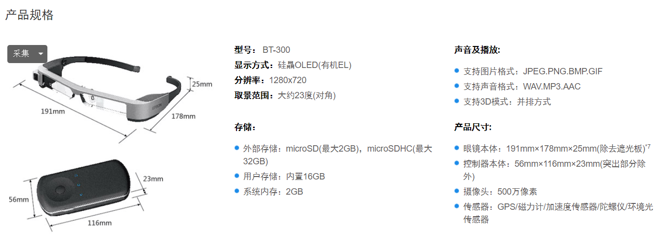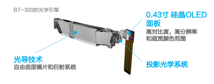 新型智能眼镜BT-300,采用硅晶OLED显示设备,显著提高画面的质感,画面显示可达到100,000:1*1的高对比度,相较前代产品有了质的飞跃。硅晶OLED所带来的高对比度和高分辨率(BT-300可以实现1280X720的高清分辨率),使得画面显示可以达到无边框效果,虚拟图像完全融入现实。并且由于面板构造,可改变光导方向,大大缩小镜片和导光板的大小。头部设备仅重69g,长时间佩戴也不易疲劳,随时随地畅快体验。