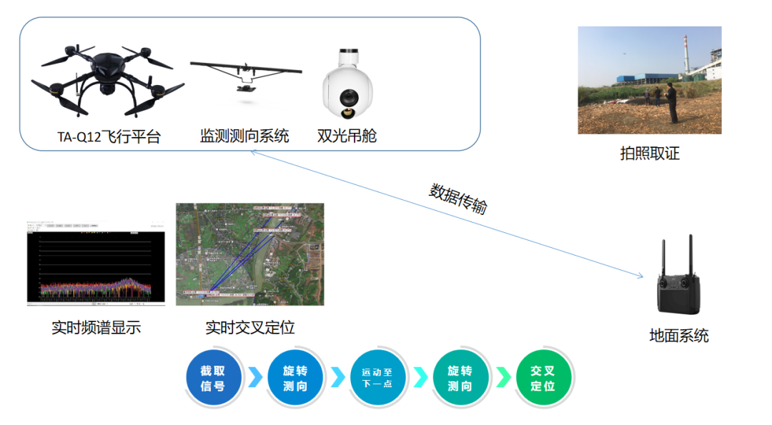 系统由TA-Q12四旋翼无人机作为飞行平台,搭载监测测向系统和双光吊舱,升空后对区域内信号干扰源进行监测并定位,发现干扰源后可通过高清变焦双光云台进行拍照取证。