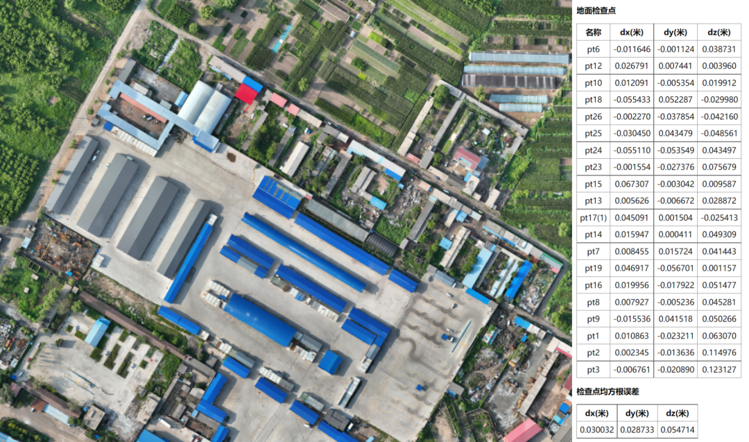 作业团队投入 1 台 Mavic 3E ,飞行 15 架次,在一天内就完成了 15km² 的 4cm 分辨率正射作业。团队采集了 9838 张色彩艳丽、亮度均匀的原片,并使用大疆智图快速生成二维正射影像,免像控空三精度达到平面 3cm、高程 5.4cm。