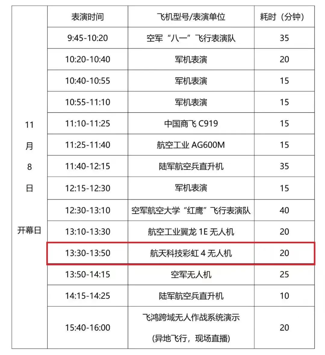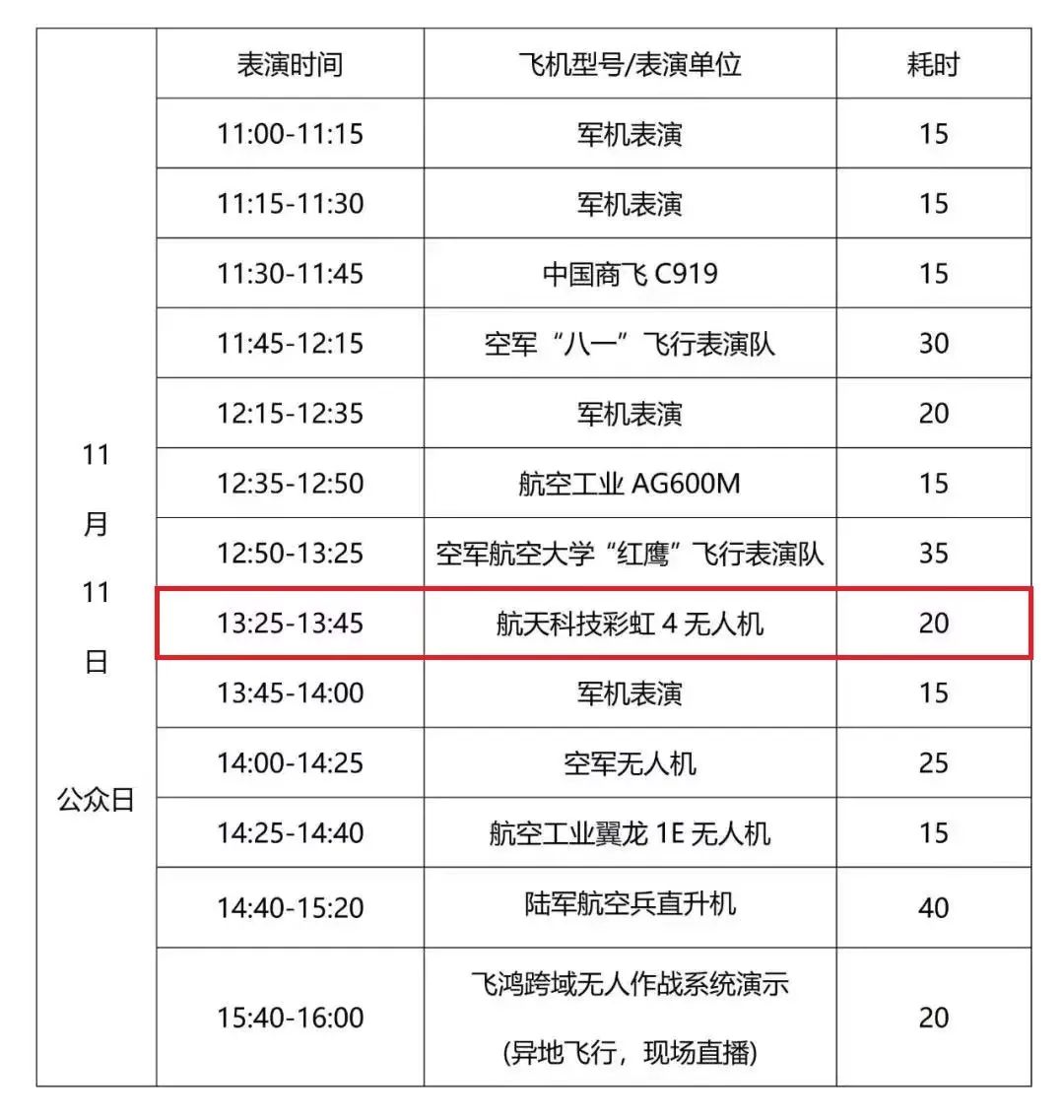 此外,8日和11日,彩虹-4无人机将带来精彩的飞行表演,敬请期待~