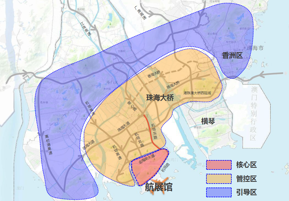 核心区为金湾区金海岸大道以南(含机场路南段,金海东路、机场路展馆路段等)区域,原则上只允许持证车辆以及公共交通工具(专线巴士、接驳巴士、旅游大巴)进入。管控区为核心区外围西部沿海高速以南的区域,将在近端有序调控交通流。涵盖道路包括:机场东路(金湾路)、机场北路、机场西路、机场高速、珠海大道、滨湖路、金海岸大道、鱼林路、琴石路、安基路、湖心路、珠峰大道等道路。引导区为除核心区、管控区以外的区域,根据交通状况变化,在远端对通往展区高速公路及主干道交通流进行实时诱导。