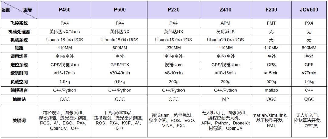 P450遵循“ 让研发更高效 ”的设计理念,基于开源飞控PX4及机器人操作系统ROS打造,内置了开源自主无人机软件平台Prometheus,提供丰富的算法demo例程,涵盖控制、规划、SLAM、目标检测、深度学习、集群控制等多个无人机及人工智能相关研究方向,旨在为无人机的智能与自主飞行提供全套解决方案。