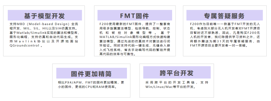 F200是目前基于FMT开源自驾仪项目开发的第一款无人机产品,支持室外定高定点、一键起飞、一键降落、一键返航、航点规划等功能。后续添加光流、激光传感器的导航支持后,可支持室内无GPS的定点功能。