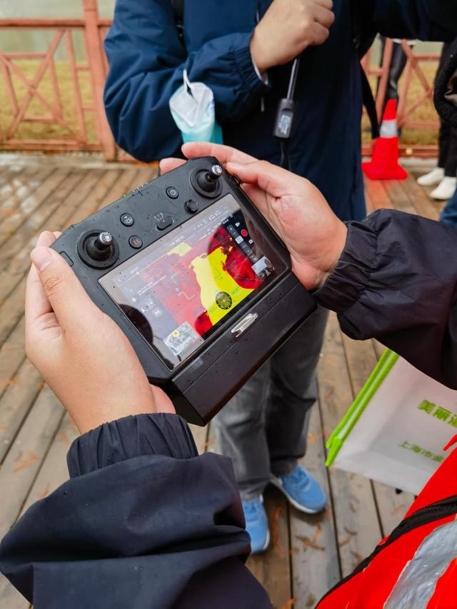 近日,在金山区战斗港河道上空,一架无人机正在盘旋飞行,岸边工作人员手中的显示屏上,实时显示出无人机传回的河道热成像图,帮助“捕捉”那些可能正在排水、排污的水下排口。