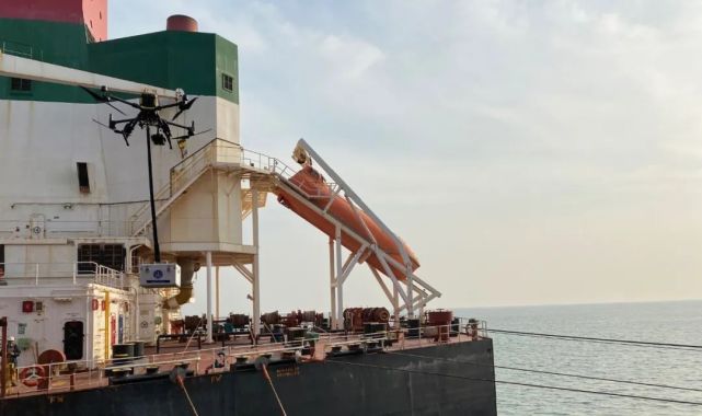 日前,董家口海事局通过使用无人机挂载云登轮远程检查设备箱,将其安全投放至外国籍超大型矿石运输船舶“SAH****”轮的尾甲板,为远程船舶安全检查做好准备。之后运用无人机对该轮外观、救生艇等完成检查,通过远程检查设备完成舱室内部及驾驶台等处的检查,并通过海上5G完成检查视频流的传输,这是董家口海事局完成的“5G+无人机”云登轮的首次成功实践。