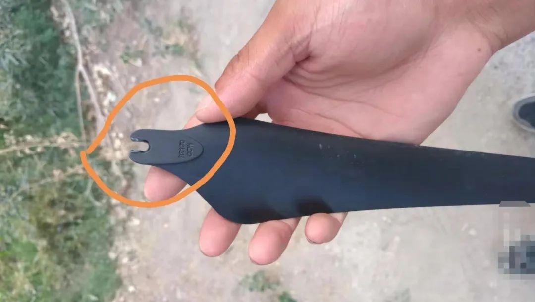 部分植保队为贪图便宜而选择非原厂的配件,其质量往往存在严重隐患。例如下图所展示的螺旋桨在飞行时从根部裂开,导致农业无人机在空中产生自旋,所幸未造成重大损失。