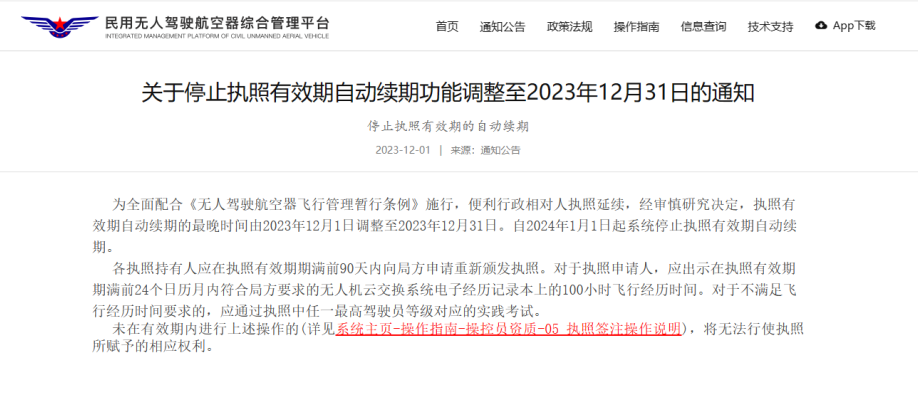 民用无人机飞行操作平台(UOM)宣布更新:为了更好地遵循《无人机飞行管理条例》(暂行),并简化行政参与者的执照更新流程,经过慎重考虑,决定将执照自动续期的最终期限从2023年12月1日延长至2023年12月31日。自2024年1月1日起,系统将不再自动延长执照有效期。