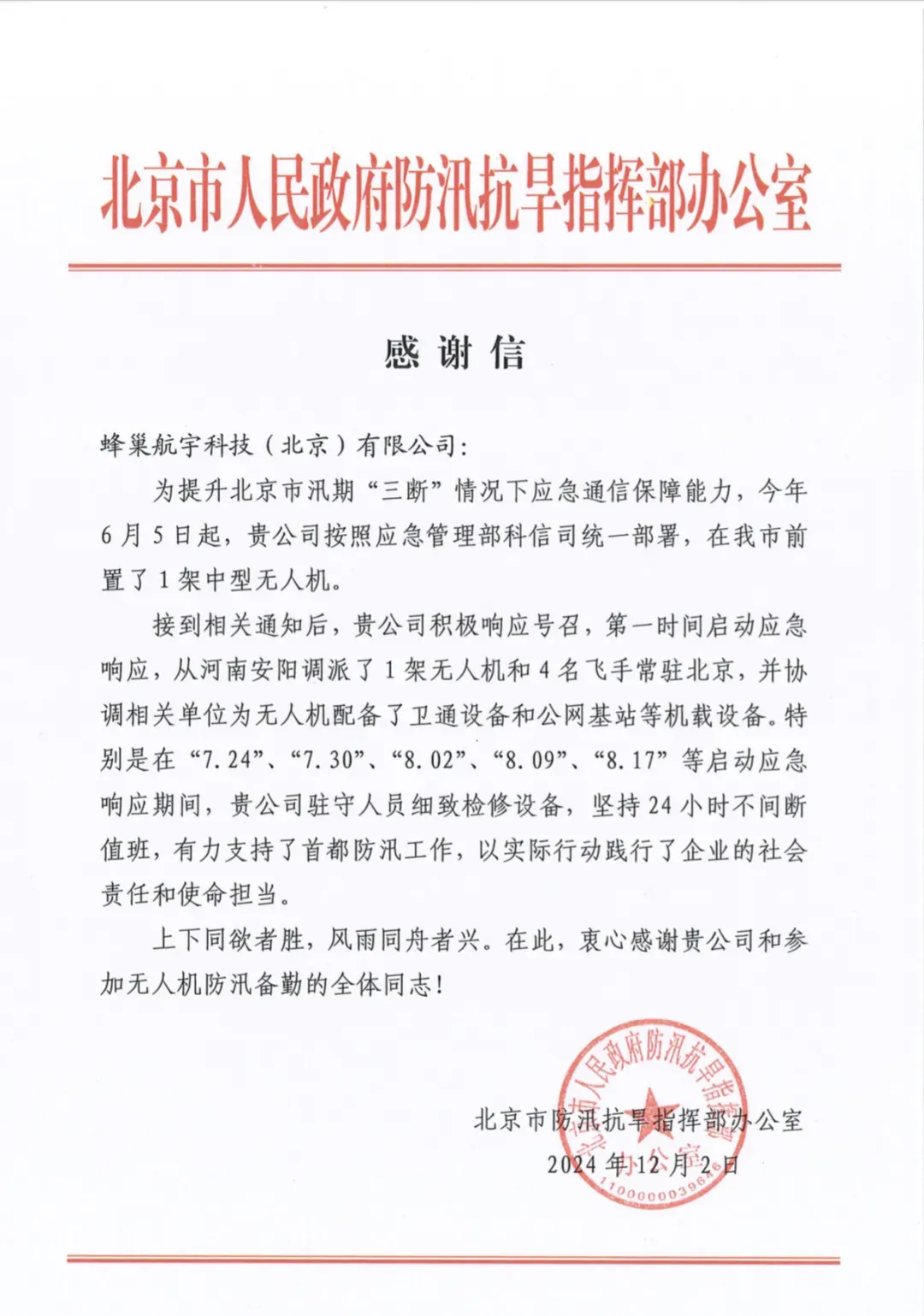 为提升北京市汛期“三断”情况下的应急通信保障能力,蜂巢航宇自2024年6月5日起,响应应急管理部号召,提前在北京部署中型无人机,并配备卫星通信和公网基站等设备,确保极端天气下设备高效运转。在多个关键节点的应急响应中,蜂巢航宇凭借专业能力和资源保障,确保任务顺利推进,获得各级领导一致肯定。
