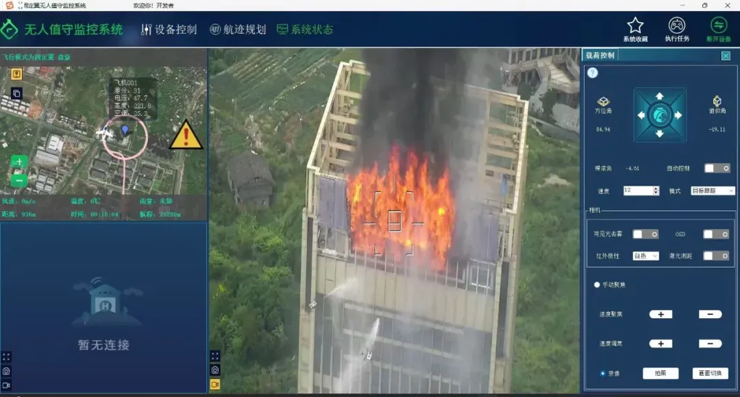 本次演练模拟实战,在全国演练楼层最高(110米)且火场面积最大(500平方米)的高层建筑进行。蜂巢航宇HC-525智能无人机的核心任务是实时监控火情,利用双光吊舱将火场图像和数据传输至指挥中心,为消防指挥员提供精准火情动态,支持决策和扑救工作。