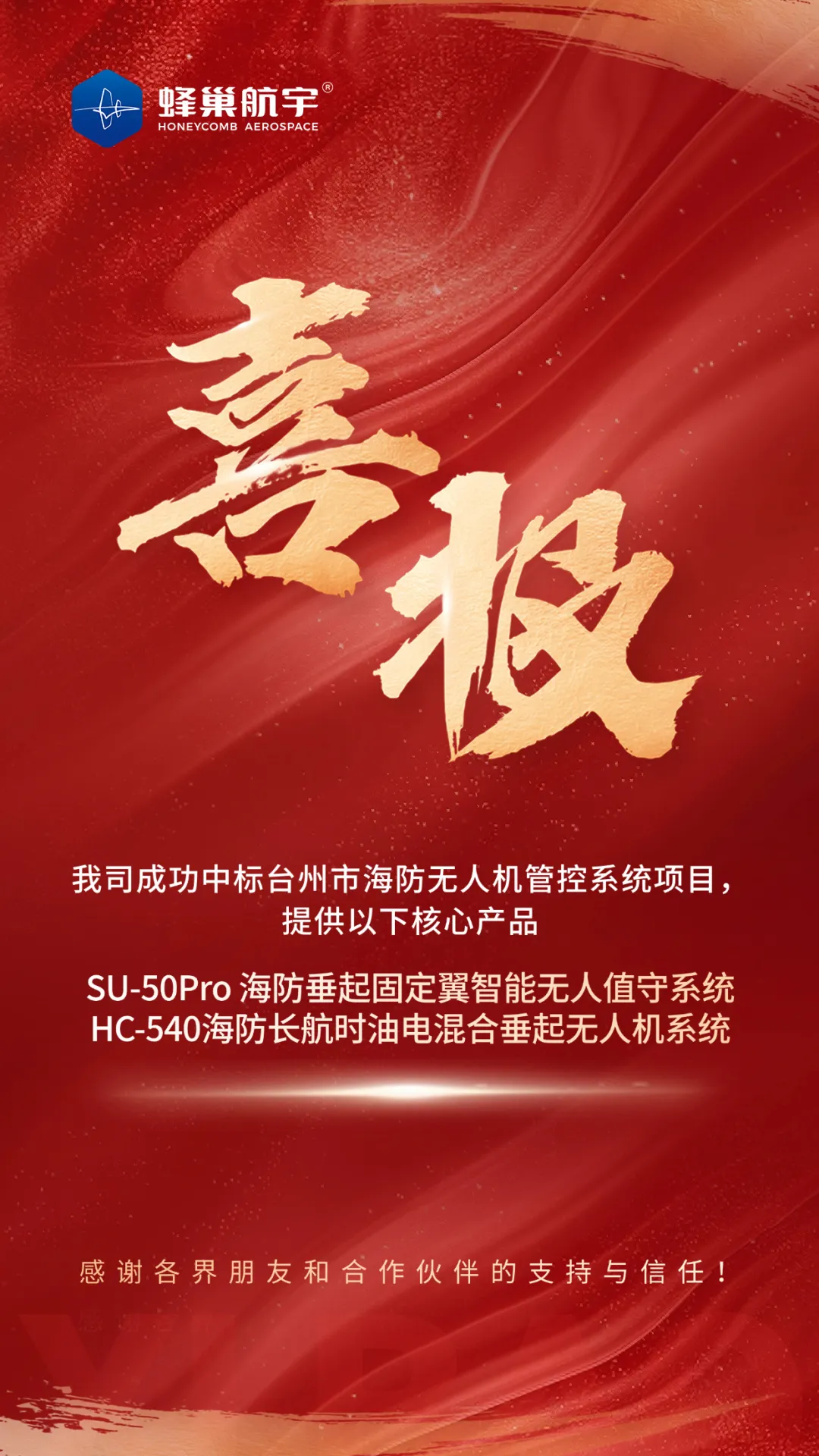 成功中标台州市海防无人机管控系统项目!在此次项目中,我司将提供SU-50Pro智能无人机场和HC-540无人机,助力台州市海防无人机管控系统的建设与升级,全面提升区域空域管理和防控能力。