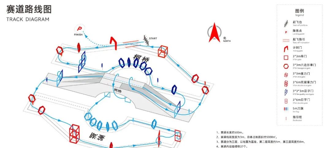赛事以“极速鉴湖,飞越梦想”为主题。赛道全长500米,设置约35个高难度障碍物。赛道的设计灵感取自于柯桥的标志性建筑——融光桥,融光立鉴湖,倒影在两边,一桥即三桥,三桥合一桥的创意设计,不仅考验了参赛者的技能,也为观众呈现了一场视觉盛宴。