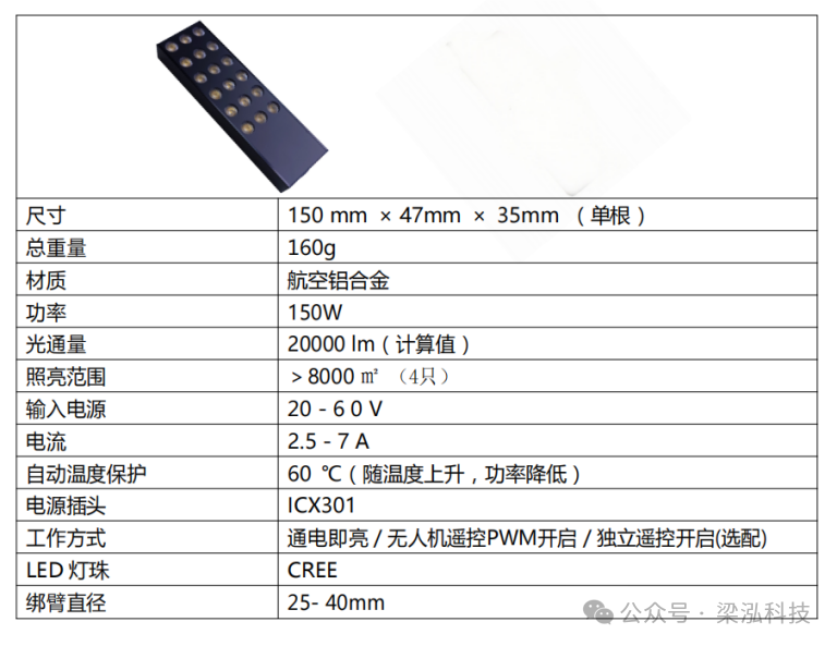 低空照明灯,适用于夜间搜救、电力抢修、拍摄补光、边防巡查、海事搜救等各种应急照明场合DC20V~60V 超宽输入范围,最大功率150W,自带热保护功能。