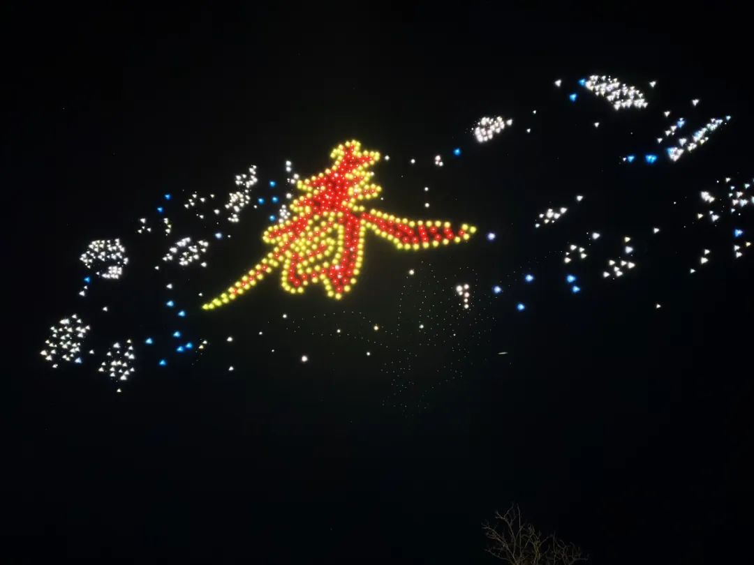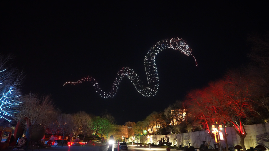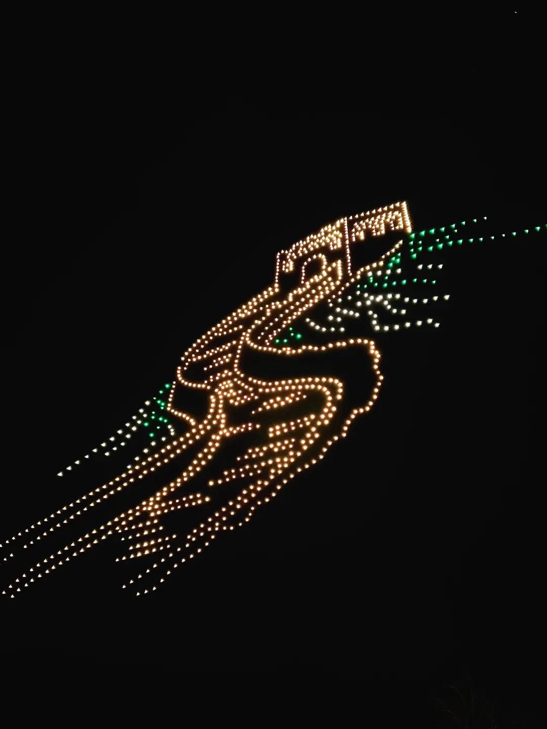 不一会儿,1000 架无人机整齐排列,先是摆出了一个奇幻的星空图案,紧接着,一条“祥龙飞腾”的图案震撼登场,巨龙身姿矫健,在动态中转换为“金蛇贺岁”;随后,气势恢宏的“长城印象”图案出现,蜿蜒的城墙、巍峨的烽火台,在无人机的光影变幻下,完美复刻了长城的雄伟壮丽。