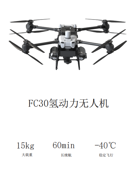 FC30氢动力无人机是一款载重15kg,飞行1h的运载无人机。此款无人机配有12.8kW氢燃料电池系统,具有耐低温、长航时优势,可广泛应用于海岛、山区、高原等长距离物资配送、应急救援场景。