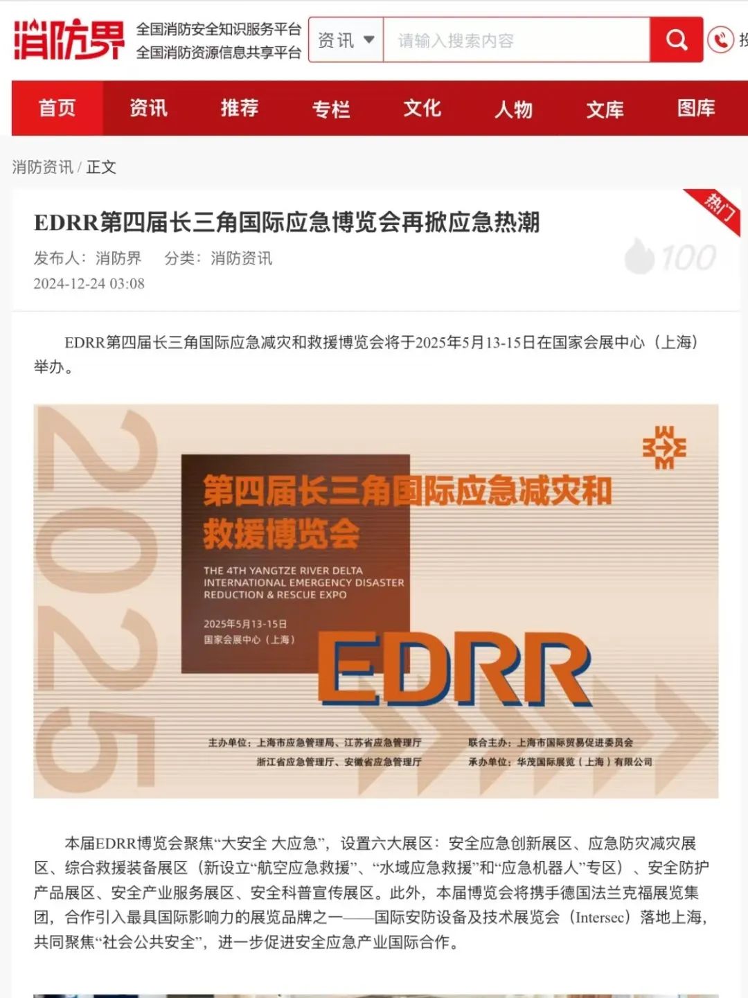 由沪苏浙皖三省一市应急管理厅局和上海市贸促会共同主办的EDRR第四届长三角国际应急减灾和救援博览会将于2025年5月13-15日在国家会展中心(上海)举办。