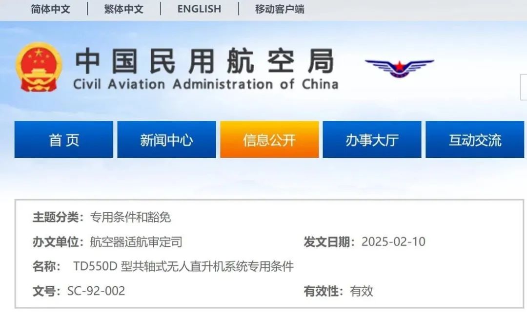 万亿低空,风云再起!2025年3月17日,中航智自主研发的TD550D无人直升机系统正式获颁中国民用航空局颁发的型号合格证(简称TC),成为全国首款通过型号合格审定的无人直升机系统。这一里程碑事件,不仅是技术合规认证的关键跨越,更是联合飞机进军万亿低空经济市场的战略新起点。