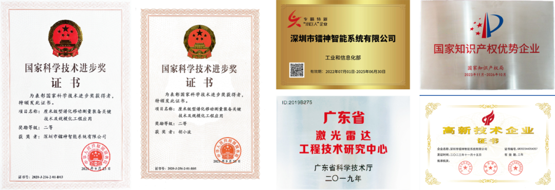 镭神智能先后获“中国光学工程学会理事单位,深圳市中小企业发展促进会副会长单位,深圳市特种装备行业协会副会长单位,深圳市智能装备产业协会副会长单位,中国中小企业理事单位,中国人工智能机器人产业联盟常务理事,中国服务机器人产业联盟理事单位,深圳市汽车电子行业协会常务理事单位”等几十项荣誉称号。