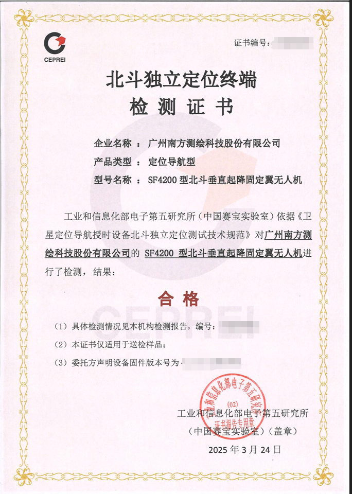 南方测绘系列无人机是由工业和信息化部电子第五研究所(中国赛宝实验室)主导的权威认证机构验证,主要测试内容包括:终端设备是否完全仅依赖北斗卫星导航系统实现定位、导航和授时功能,确保产品质量、信息安全及技术自主可控。