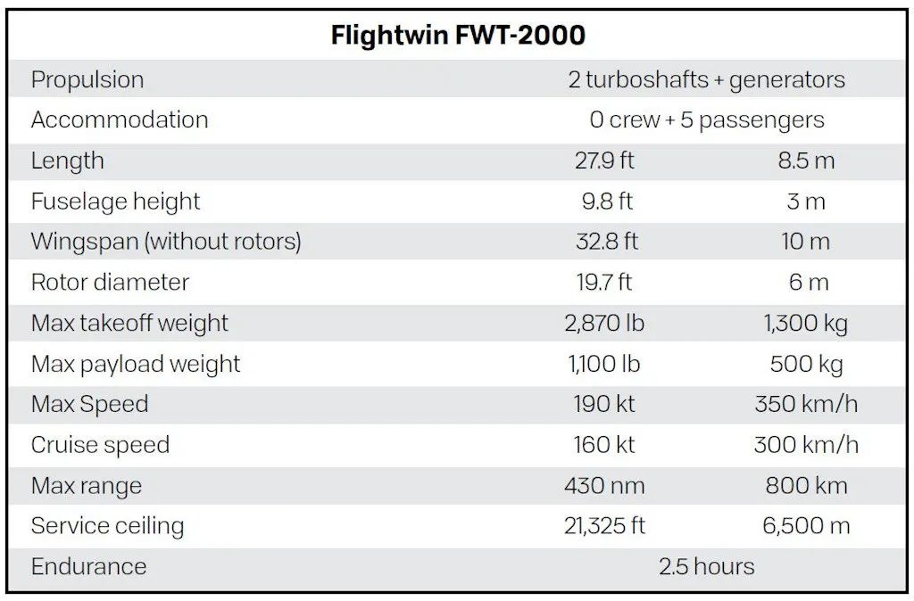 “FWT-2000突击鹰”是一款1.5吨级双发混动倾转旋翼有人/无人驾驶载人飞行器,能够商载5名乘客或500公斤物资,巡航速度可达300公里/小时,最大航程800公里,填补了长航程、大载重eVTOL市场的空白。该机型具备普通直升机垂直起降及空中悬停能力,同时具备固定翼高速巡航飞行能力,支持平原、高原、岛礁及海上平台起降,用于低空通勤、医疗救援、物资运输等载人、载货多种低空应用场景。