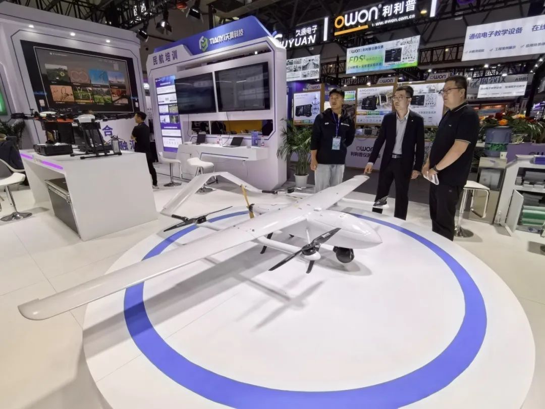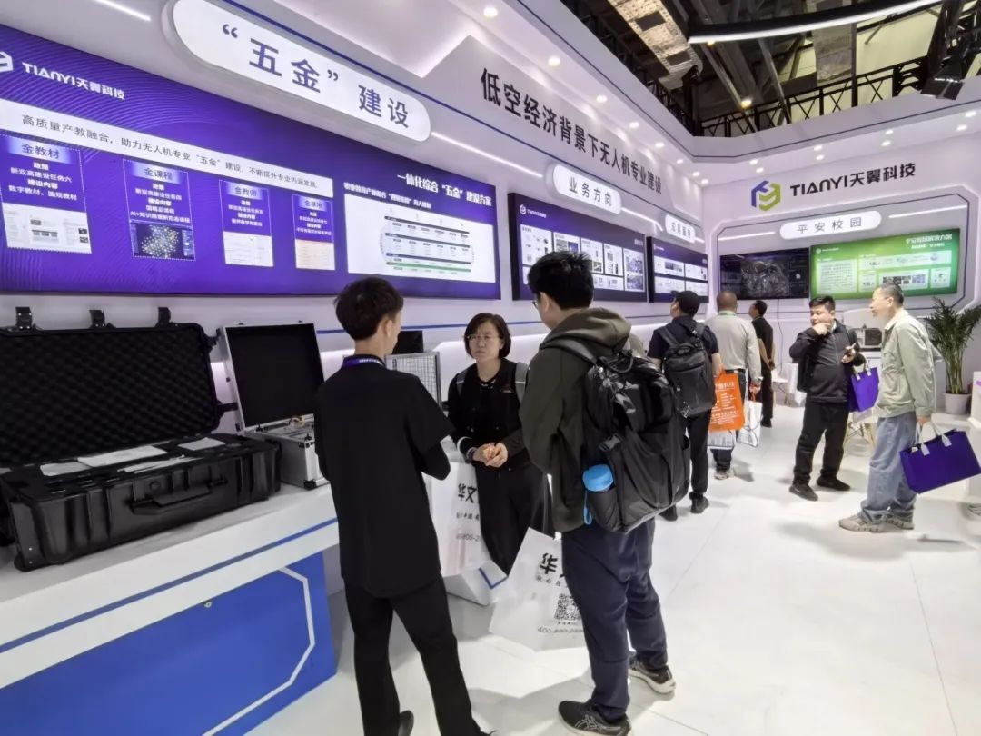 天翼科技展位上,以“低空经济背景下无人机专业建设”为主题的展示内容,集中展示了天翼科技在“五金”建设、教学资源、赛事支持、职教出海等各个板块的最新成果。