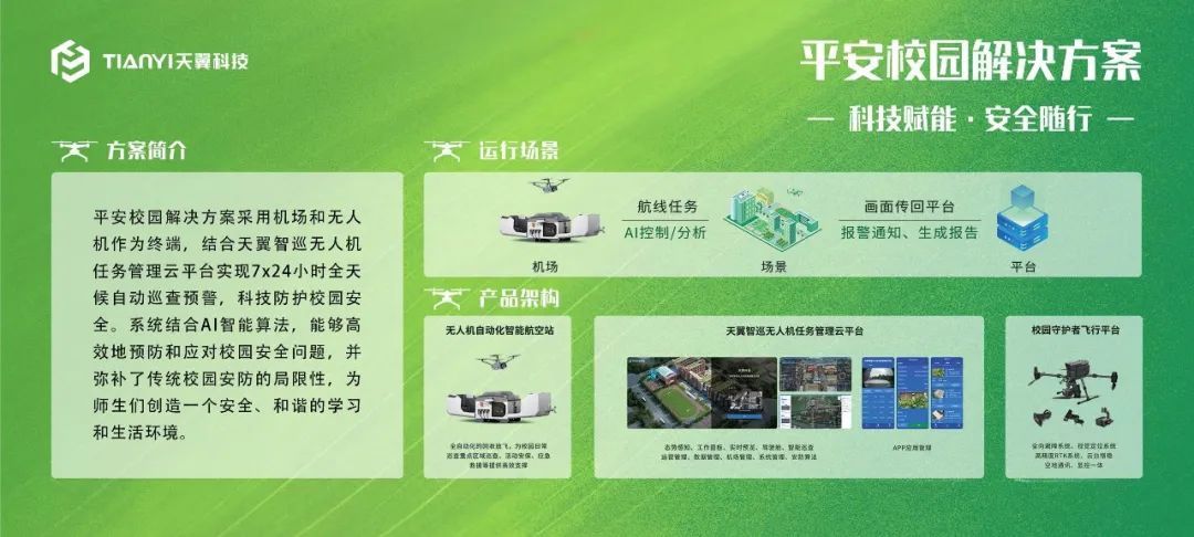 校园安全一直是教育工作的重要环节。天翼科技平安校园解决方案,通过无人机机场硬件产品+无人机任务管理云平台的现场演示,全面直观地体现了天翼科技在校园安全领域的核心技术优势与亮点。