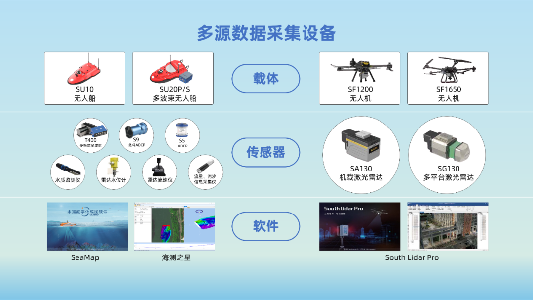 南方测绘“天空地水工”一体化监测感知体系,通过集成卫星遥感、北斗导航、无人机巡检、地面自动监测站、水下探测设备等多种监测手段,结合先进的数据处理与分析算法,全天候、全方位获取水利全要素,助力水库大坝安全监测、雨水情“三道防线”建设、水利工程建设等。装备一览