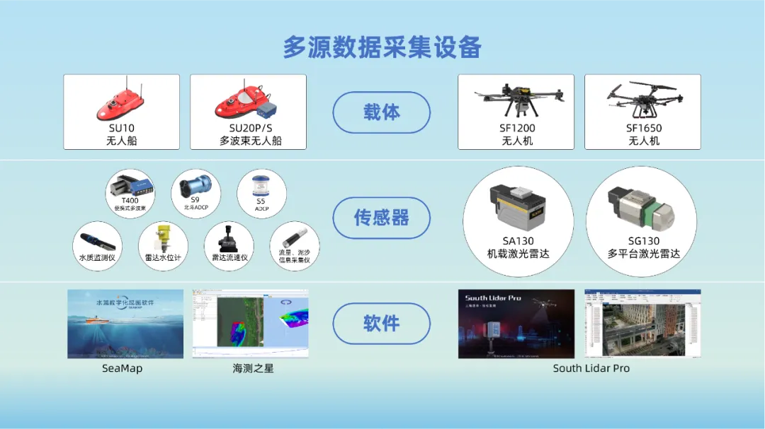 此外,南方测绘还针对水文水利、水务、海洋、航道、港口等不同应用场景,展示了其他众多自主研发的测量装备及解决方案。