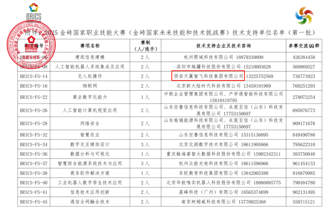 今天(6月10日),第一批2025金砖国家职业技能大赛(金砖国家未来技能和技术挑战赛)技术支持单位公布。西安天翼智飞科技集团有限公司凭借在无人机教育、应用及赛事领域的深厚积累与卓越实力,成功入选成无人机操作赛项技术支持单位!这是对天翼科技技术能力、行业贡献及国际化服务水准的权威认可。