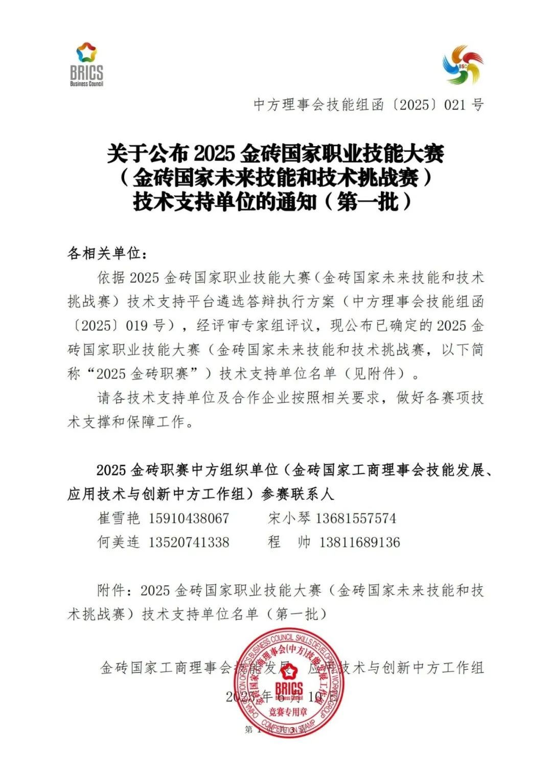 “金砖国家职业技能大赛”是由金砖国家工商理事会(BRICS Business Council)发起并主办的重要国际性赛事。大赛旨在落实金砖国家领导人共识,搭建高水准、国际化的职业技能竞技与交流平台,深化金砖国家在职业教育领域的合作,共同推动未来技术技能人才的培养与创新发展。