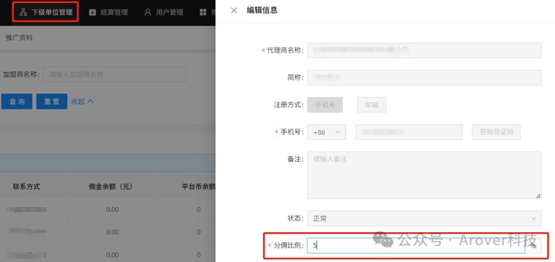 :一级代理可实时调整二级代理商佣金比例,系统自动同步至对应账户,满足多样化合作需求。
