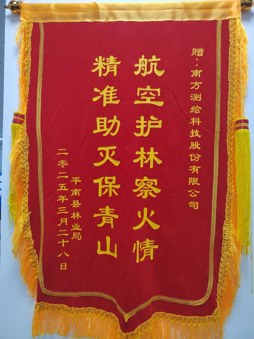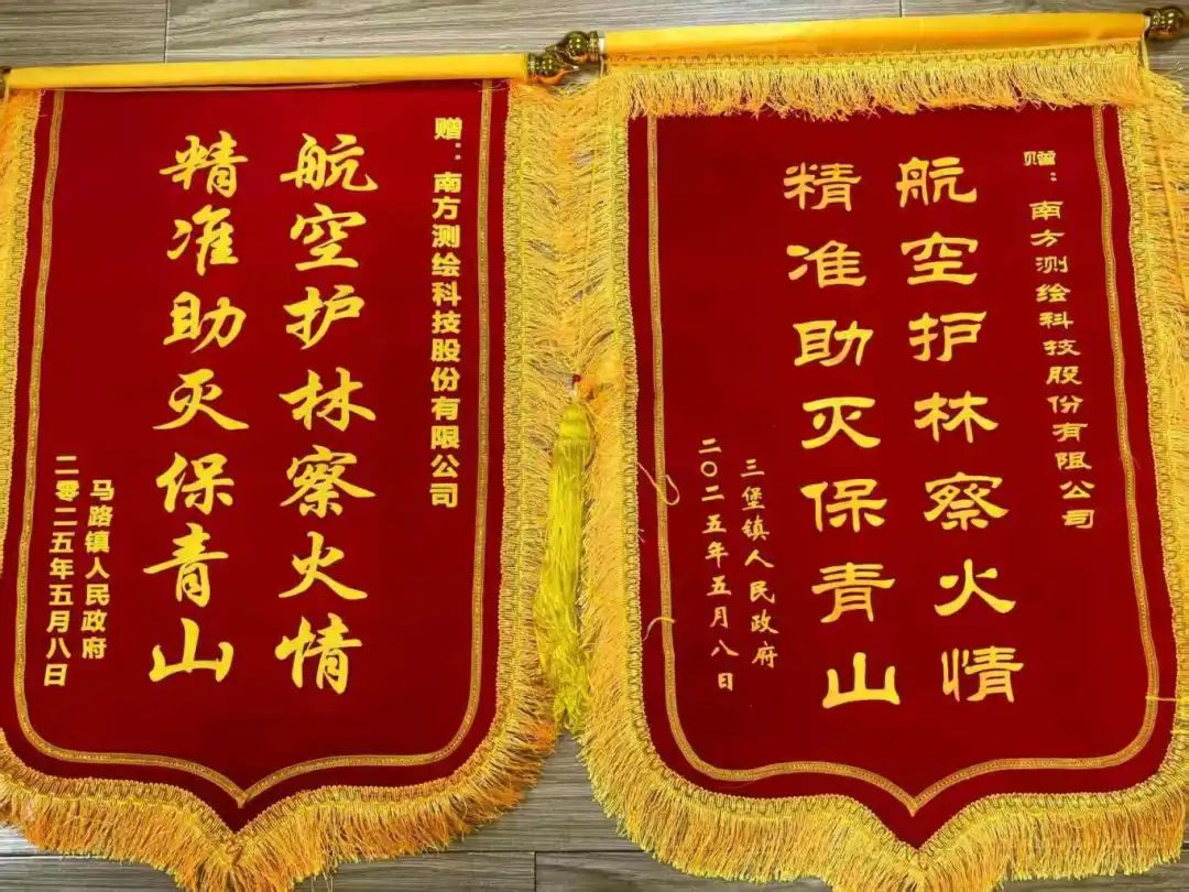 在平南县官成火情处置中,南方测绘团队凭借精准定位和实时数据支持,协助消防部门在黄金3小时内控制火势,获赠“航空护林察火情,精准助灭保青山”锦旗。