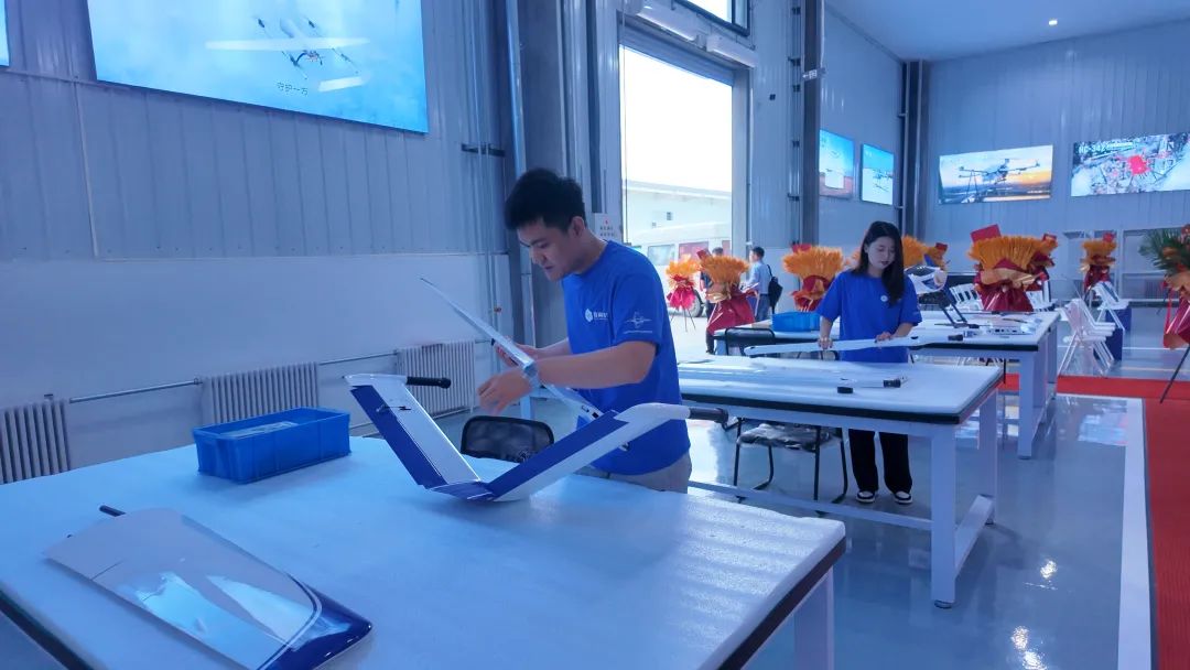 投产典礼后,蜂巢航宇副总经理王建武带领嘉宾参观了蜂巢航宇内蒙古公司的长航时垂起固定翼无人机总装产线。该产线可实现多类型无人机产品的规模化生产,充分展示了企业在高端装备制造方面的硬核实力。