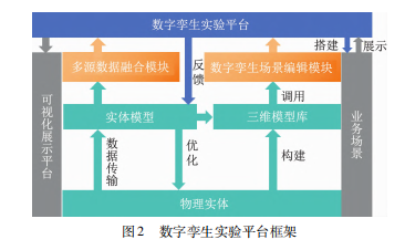 基于物联网、大数据、云计算和人工智能等技术构建的数字孪生实验平台实现物理世界与数字世界的无缝连接与交互。通过传感器数据、历史数据、设计模型等多种信息融合,提供全面、实时、可交互的虚拟镜像系统,帮助推演者更好地完成目标任务,决策者在决策中更好地理解、分析和优化实体对象的性能和运行状况。数字孪生实验平台框架如图2所示。