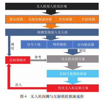 (2)模拟推演与辅助决策模块。模拟推演与辅助决策模块实现对无人机的实时监测与预警,集成无人机探测与反制策略推演以及辅助决策等功能。充分利用多源数据融合系统接收前端感知设备传输的数据,捕捉入侵无人机信号,分析信号特征以确定无人机的位置、速度、航向等重要信息,实现对空域内无人机的快速发现与识别。同时,模块还具数据分析和处理能力,根据实时监测数据和历史数据,对无人机侵袭活动综合分析,评估其潜在威胁,并根据评估结果,推演反制策略,包括何时实施反制,采取何种反制手段, 如:电磁干扰、GPS欺骗、激光毁伤等方法使无人机失去控制、偏离航线或迫使其降落等,制定反制策略,试验反制效果,判断策略的可行性,并不断改进策略,并将最终推演策略存入反制策略库,以备后期遇到类似的无人机侵袭,模块能提供预设策略推演方案,用户可在此方案基础上根据模拟现场情况制定反制方案。 同时为决策者提供直观、便捷的操作界面,实时展示无人机侵袭活动情况和反制策略推演结果,为决策者提供辅助决策作用。支持各类反无设备并预留第三方软件接口,便于未来技术升级和扩展。无人机探测与反制模拟推演流程如图4所示。