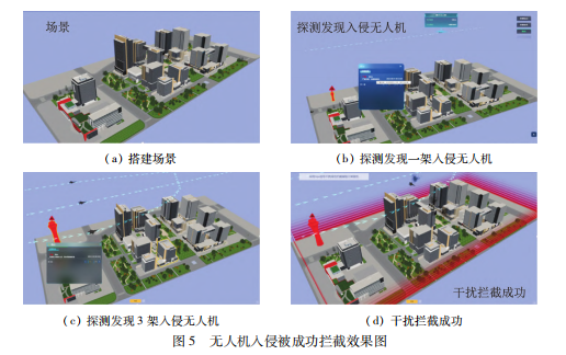 模型库中预设多种型号无人机,用户可根据需要自定义模型,也可实现第三方软件导入模型。同时构建通用模型库以及行为模型库,用于场景搭建。用户可根据需要,通过简单拖拽模型库中模型到自定义场景,实现个性化布局,也可根据实际场景模型构建。在自定义搭建三维训练场景的基础上,部署探测设备,用于实时发现入侵无人机,报警提示有非法入侵无人机进入监测范围空域并及时采取措施摧毁非法入侵无人机。如图5所示为无人机入侵被成功拦截效果图。该无人机侵袭案例中,当敌机进入设定场景监测区域,无人机探测设备成功探测到有敌机进入,塔台及时提示告警信息并用红色提示严重告警:尽快采取措施拦截。 同步提供无人机型号、数量、实时飞行高度、飞行速度等基础信息,为制定反制策略提供数据支撑。采用GPS信号干扰,成功拦截并摧毁3架非法入侵无人机。