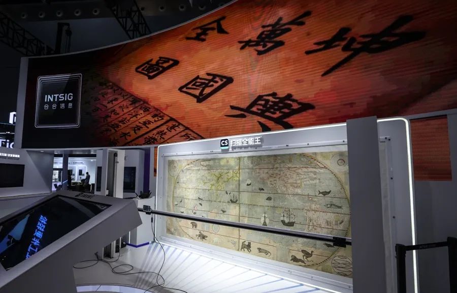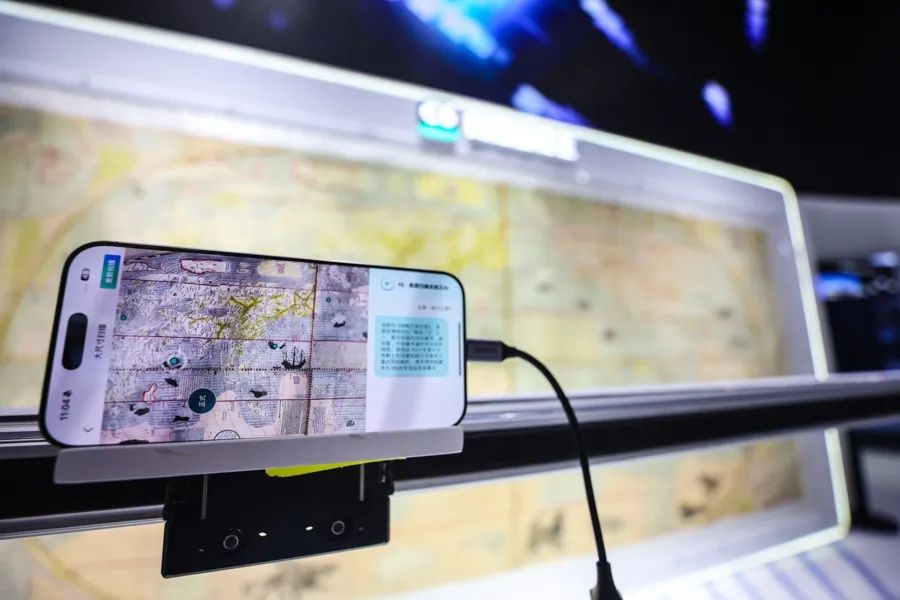 在合合信息展台前,扫描全能王推出以“大尺寸扫描”功能为代表的“无限扫描”黑科技,向《坤舆万国全图》等古老的文物进行“提问”。在现场看到,南京博物院“镇院之宝”《坤舆万国全图》借助AI工具实现了高清复刻。这幅成图于1608年、长 3.85 米的巨型古地图,展示了如何用AI对巨型画作进行高清扫描和无痕拼接,观众只需上下滑动拍摄视频,AI便能智能拼接片段,消除错位、色差与模糊,将400年前的地理智慧浓缩于掌心,可实现将“国宝”一键装进手机。