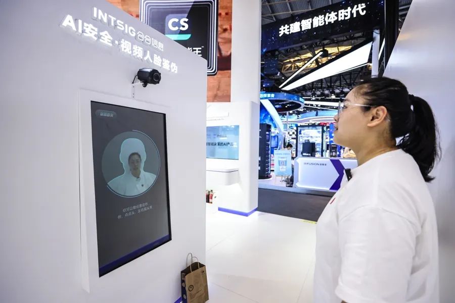 在合合信息AI安全展台互动区,观众正在体验一场“真假人脸”的科技较量。站在屏幕前扫描面部,系统就会实时生成一个“数字假面”,当真假人脸同屏对比时,不少观众惊讶地发现,AI伪造面容近乎完美地复刻了真实人脸的表情纹路。展会互动装置中实时生成的“假脸”,由当前主流伪造算法之一“ROOP算法”生成,在合合信息AI人脸鉴伪模型的解析下,一张张“假脸”被精准挑出。