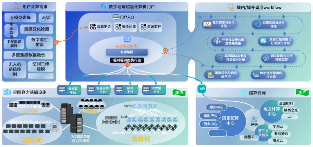 星图超算云网以数字地球超级计算机为核心,打造跨域协同的智能算力调度平台,实现国家级算力资源的高效互联与统一运营。
