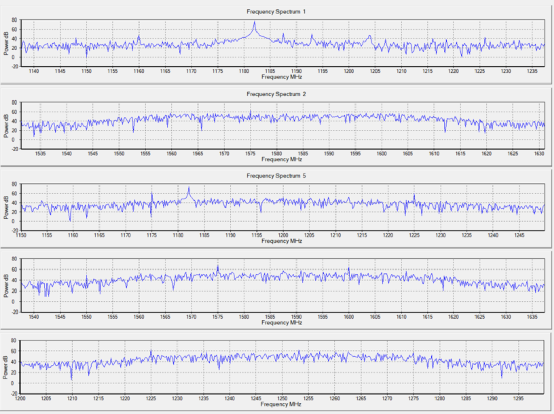 3.3 支持抗干扰开关热切换 抗干扰通道与无抗干扰通道可以实现无缝衔接。通过干扰自适应探测模块,系统会实时判断每个信号频点是否受到干扰。对于检测到干扰的频点,自动开启相应的抗干扰模块;而未检测到干扰的频点则关闭该模块。在信号正常跟踪时,系统可实现抗干扰模块的热切换,整个过程对信号接收无影响,既确保了有干扰时自动防护、无干扰时节能,也保证了信号的持续稳定。 3.4 干扰信号频谱显示 模块实时采集原始射频采样数据,经由快速傅里叶变换(FFT)和滤波处理后得到频谱数据,再将频谱数据以报文形式输出即可通过窗口实时显示干扰信号频谱,以便快速准确观测干扰信号的变化。 通过窗口实时显示干扰信号频谱,上图所示在射频通道1上存在1182MHz的单音干扰 Part 3 技术意义与行业价值 从本次实测可以看出,QC7820在双通道抗干扰架构下,兼顾了高性能与低功耗。在单音双通道测试中展现出的延迟失锁能力,直接提升了无人机在电磁复杂区域的飞行安全性;在扫频干扰测试中的平稳曲线,则为电力巡检和车载导航提供了可靠保障。更重要的是,关闭抗干扰算法后仍具备较好抗性,意味着QC7820可以在低功耗模式下运行,对穿戴设备和小型传感器尤为关键。 与友商模组相比,QC7820的优势在于双通道协同带来的抗多频干扰能力;与K823相比,其在稳定性与后期恢复能力上更具优势。展望未来,GNSS抗干扰技术的焦点将进一步扩展至欺骗干扰检测与AI自适应识别。QC7820的双通道架构为此提供了良好的扩展空间:一条通道可专注于常规抗干扰,另一条通道可部署实时AI模型,实现快速识别与策略切换。